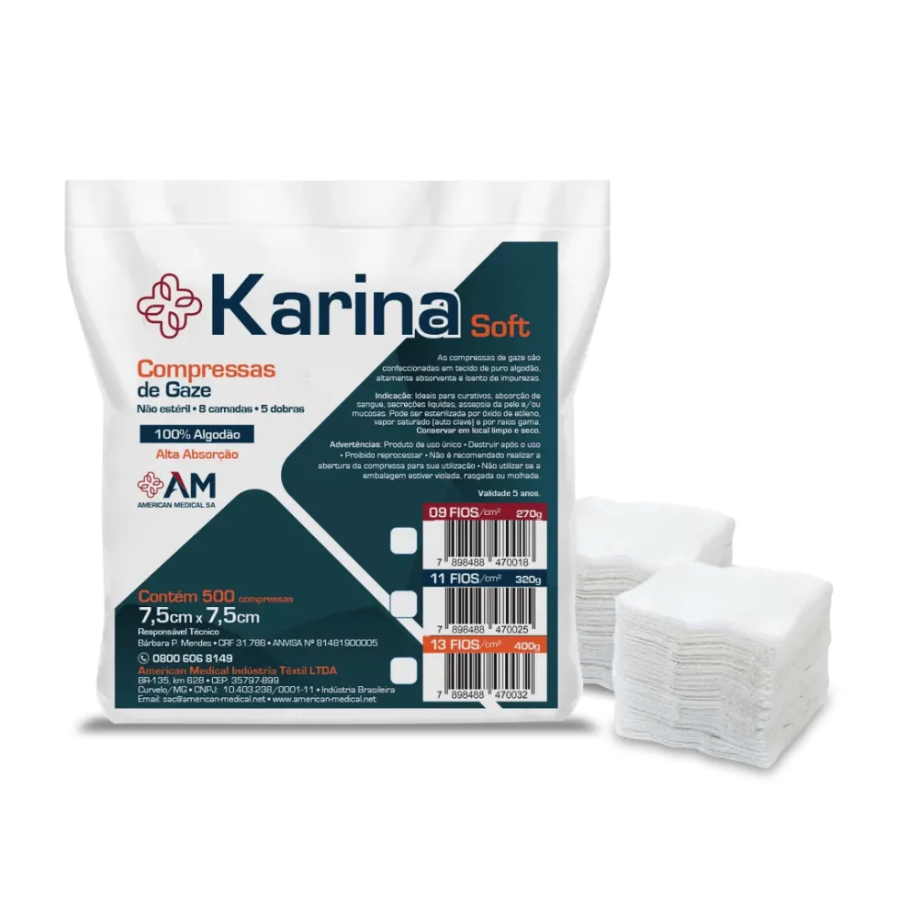 A Compressa de Gaze Karina, é um produto de curativo confeccionado em 100% algodão, oferecendo alta capacidade de absorção e maciez. Medindo 7,5x7,5 cm quando fechada e 15x26 cm quando aberta, a gaze é composta por 9,11 ou 13 fios e não é estéril, sendo ideal para uso em diversos procedimentos de higiene e cuidados com a pele. Sua estrutura permite fácil manuseio e adaptação a diferentes áreas do corpo, garantindo eficiência e conforto no uso.